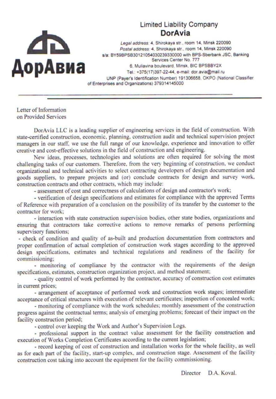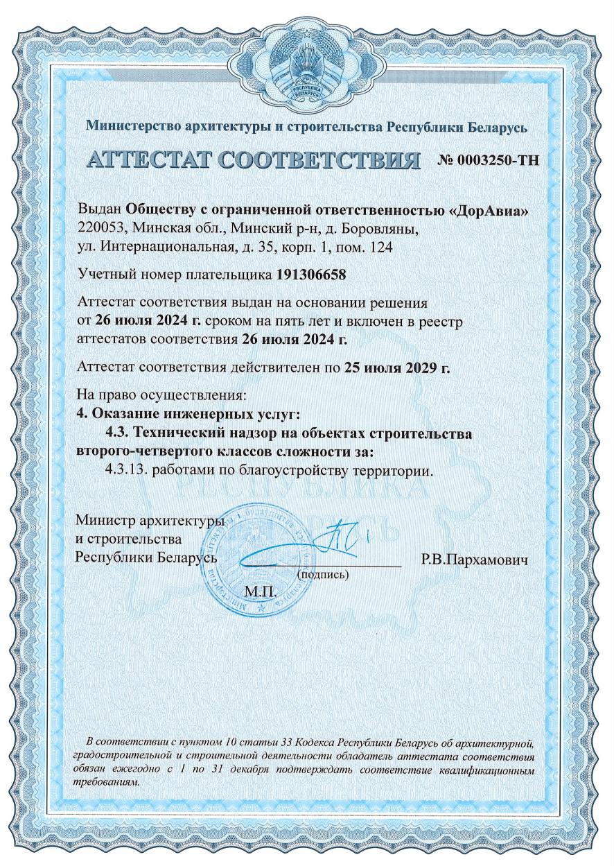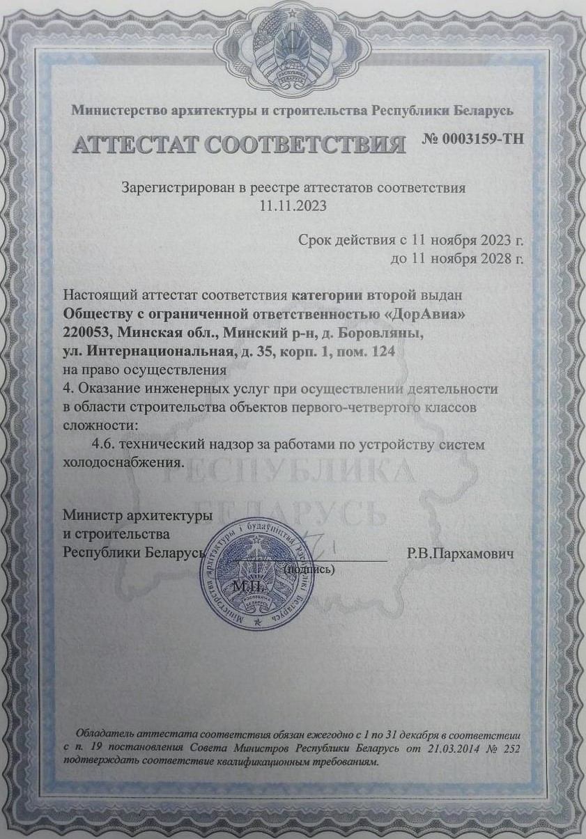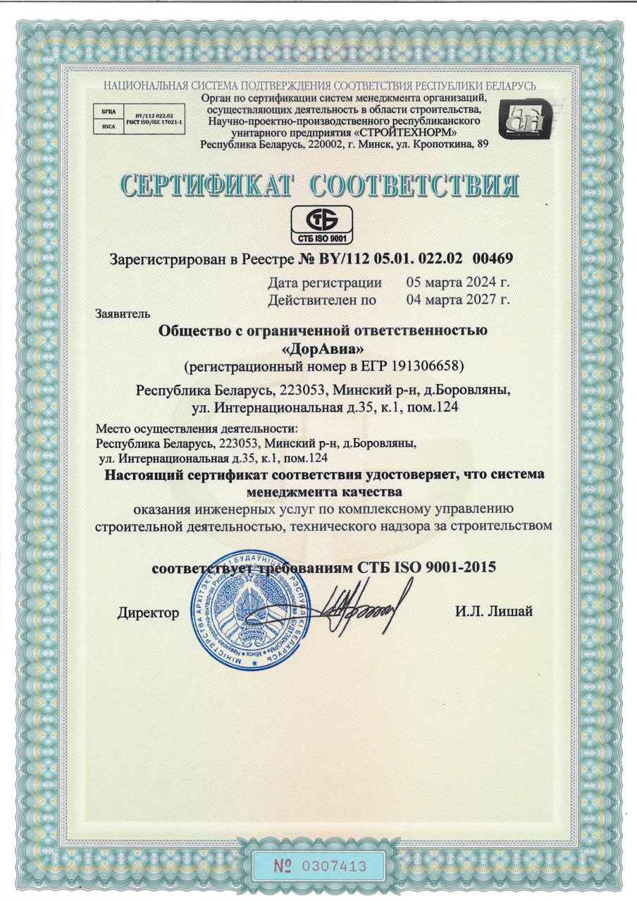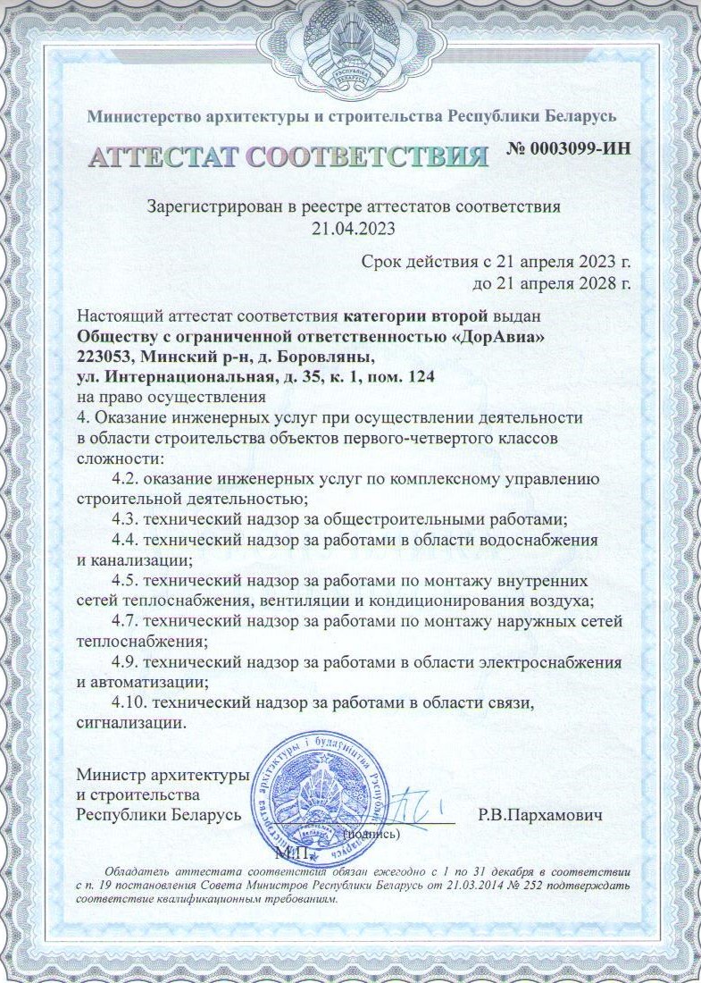 Мы имеем аттестат соответствия второй котегории, на осуществление инженерных услуг, технического надзора, комплексного управления строительной деятельности. Согласно системы контроля менеджмента качества СТБ ISO 9001-2015